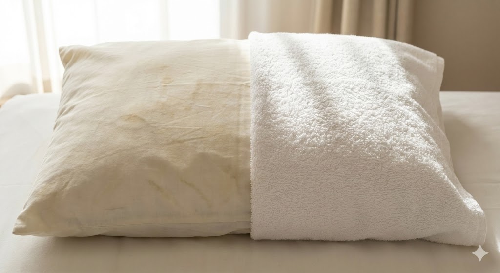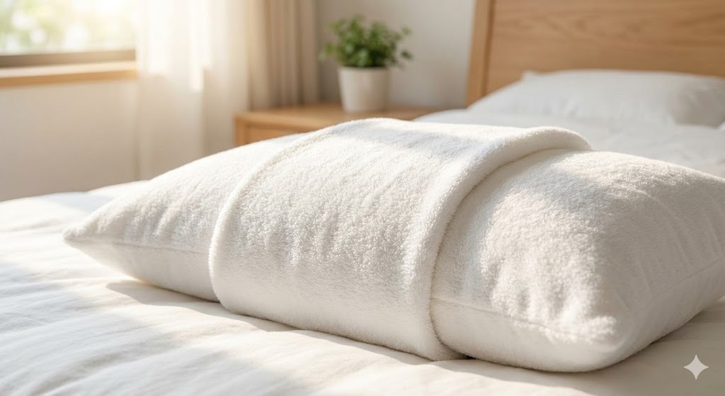 - バスタオルで包む: フェイスタオルではなく、大きめのバスタオルを使います。枕全体をくるむように巻き付ければ、どんなに寝返りを打っても外れません。 吸水面積も広がるため、汗っかきの方には特におすすめです。