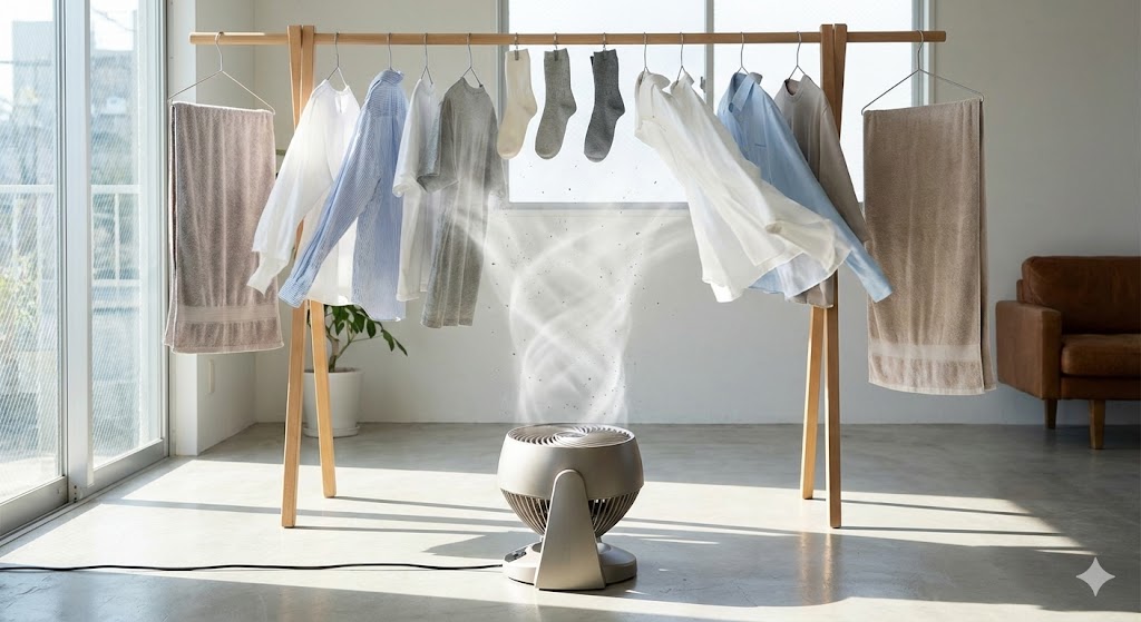 - サーキュレーター: 「空気を循環させるため」の機械です。部屋の空気を攪拌するために、直進性の高い、ビームのような強力な風を遠くまで飛ばします。 部屋干しに必要なのは、繊維の水分を弾き飛ばす「風圧」と「風速」です。だからこそ、サーキュレーター一択なのです。