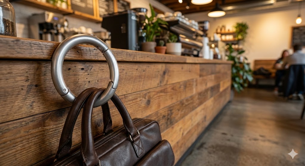 逆に、カフェや打ち合わせの席で、サッとバッグハンガーを取り出し、カバンをテーブルの端に掛けて、宙に浮かせて大切に扱っている姿。