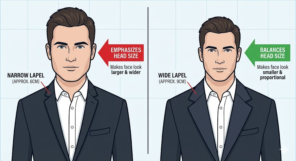 太いラペルが、顔の大きさを「受け止める」役割を果たしてくれるのです。