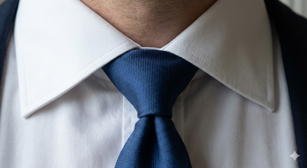 × レギュラーカラー(狭い襟): 最も一般的な襟型ですが、襟の開き角度が狭いため、顔の横幅がはみ出して見えてしまいます。 顔の大きさが強調され、「丸顔」や「エラ張り」が目立つ原因になります。