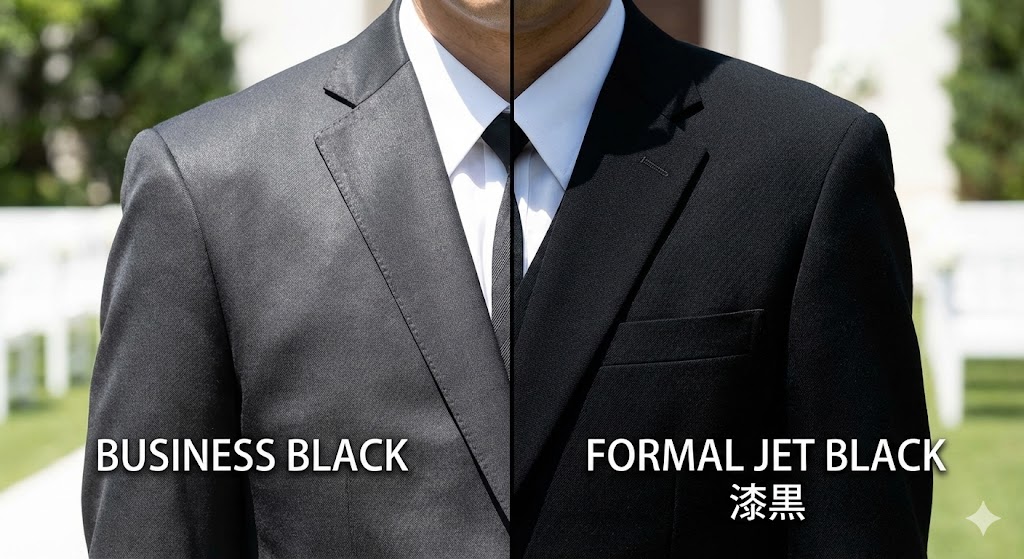 蛍光灯やダウンライトの薄暗い室内であれば、ビジネススーツの黒も、礼服の黒も、肉眼ではそれほど大きな差を感じません。
