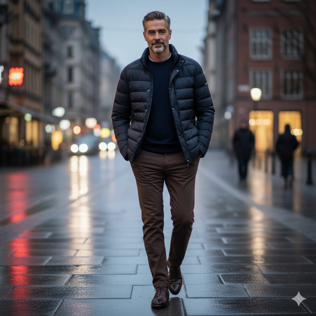 - 特徴: 暖かいのにスマートに見えることが最重要。ステッチ(キルティング)が細かく、マットな質感を選ぶことで、都会的なシルエットが実現します。光沢のある派手なダウンは避けるのが鉄則です。